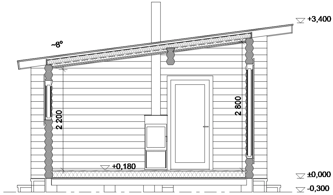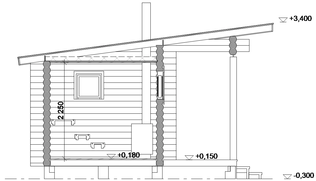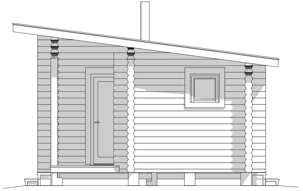 Rakennus muodostuu kahdesta osasta: saunasta sekä oleskelutilasta. Saunan lauteilta avautuu näkymät veden äärelle ja oleskelutilaan on suunniteltu moderni avara ikkuna, josta voi katsella kauniita maisemia. Oleskelutilaan on suunniteltu takka lämpöä tuomaan ja tilan käyttö on suunniteltu käytännöllisesti, jotta siellä mahtuu esim yöpymään sekä ruokailemaan. Väliterassin ansiosta saunan höyryt ja lämpö eivät kulkeudu oleskelutilaan. Terassille voidaan rakentaa kaiteet lisäilmettä ja suojaa tuomaan. Tämä mökkimalli sopii erinomaisesti rantaan ja isojen ikkunoiden läpi voi ihailla kaunista maisemaa.